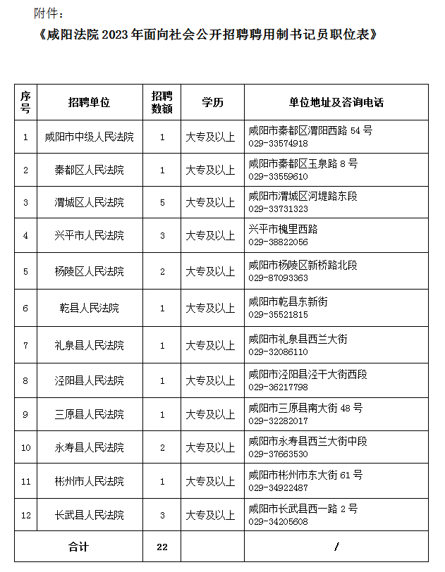 全市法院共招聘聘用制書記員22名,各法院招聘職位、地址及政策咨詢電話詳見《咸陽法院2023年面向社會(huì)公開招聘聘用制書記員職位表》(附件)。
