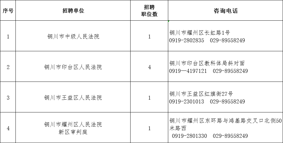 本次招考擬向全市公開招聘聘用制司法輔助人員7名。各法院招聘職位、地址及政策咨詢電話詳見《銅川法院2024年度面向社會公開招聘聘用制司法輔助人員職位表》(附件)。